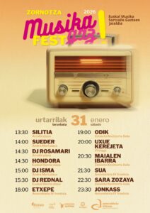 Egitaraua 13:30ean hasiko da Arraibi plazan, Silitia taldearen kontzertuagaz, eta egun osoan zehar musika emonaldiak izango dira herriko hainbat eszenatokitan banatuta: Andra Mari plaza, Euskal Herria plaza, Zelaieta kontzertu gela, Vintage taberna eta Amorebieta IV frontoia. Jonkass zornotzarrak eskainiko dau azken kontzertua, 23:30ean. Kontzertu guztietarako sarrera doakoa da, edukiera bete arte.