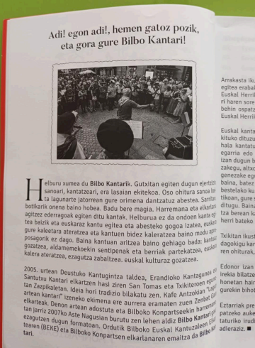 Bilbo Kantari ekimenak kantu-liburu barritua argitaratu dau. 2005. urtean Bilbon sortu zan kantujiratik datorren ekimena da honakoa. Hasieran Erandio, Santutxu eta Deustuko taldeak batzen ziren Santo Tomas egunean eta Txikiteroen egunean. Bilboko Konpartsakaz batu ziran eta 2007. urtetik Aste Nagusian be hartzen dabe parte. 2007. urtean bertan eta 2014.ean, kantu-liburuak argitaratu ebezan. Oroigarri bat eukiteko egin eben eta kantajiretan erabiltzeko. Honakoa beraz, hirugarrena da. Gogoratu daigun, hileko bigarren zapatuetan izaten dala Bilbon kantujirea. Josu Zaratek azaldu deuskunez, Zazpi Kaleetan ibiltzen dira. Inoiz, San Frantzisko edo Indautxuko jaietan izan dira eta ohikoa da euren emonaldia Olabeaga auzoko jaietan.