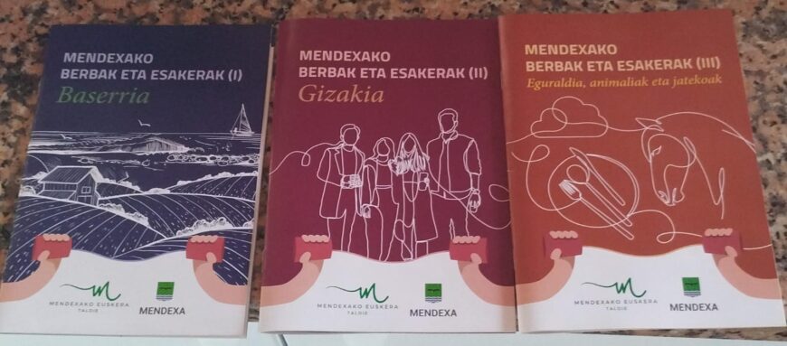 Mendexako Euskara Taldeak eta Mendexako Udalak Mendexako berbak eta esakerak liburuxkaren hirugarren alea argitaratu dabe. Oraingo honetan, eguraldia, animaliak eta jatekoak batu dabez, Mendexako hiztegia eta esaerak galdu ez daitezan.