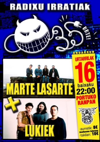 Gaueko 22:00etan hasiko dira kontzertuak Portuko Ranpan, Marte Lasarte eta Lukiek taldeakaz. Txomin L. Aramaio Radixu Irratiko kideak gogorarazo dau, Radixu irratia, irrati librea eta autogestionatua dala. Urteurreneko ospakizun hau, gainera, irratiak urte guztian egiten dauan autofinantzaketarako dinamikagaz lotuta dator: besteak beste, Zapato Azule jaialdiagaz, Radixuk antolakuntzan parte hartzen daualako. Sarrerak Ondarroako Anaitasuna tabernan eskuratu daitekez, eta geratzen diranak leihatilan ipiniko dabez bertan, Portuan.
